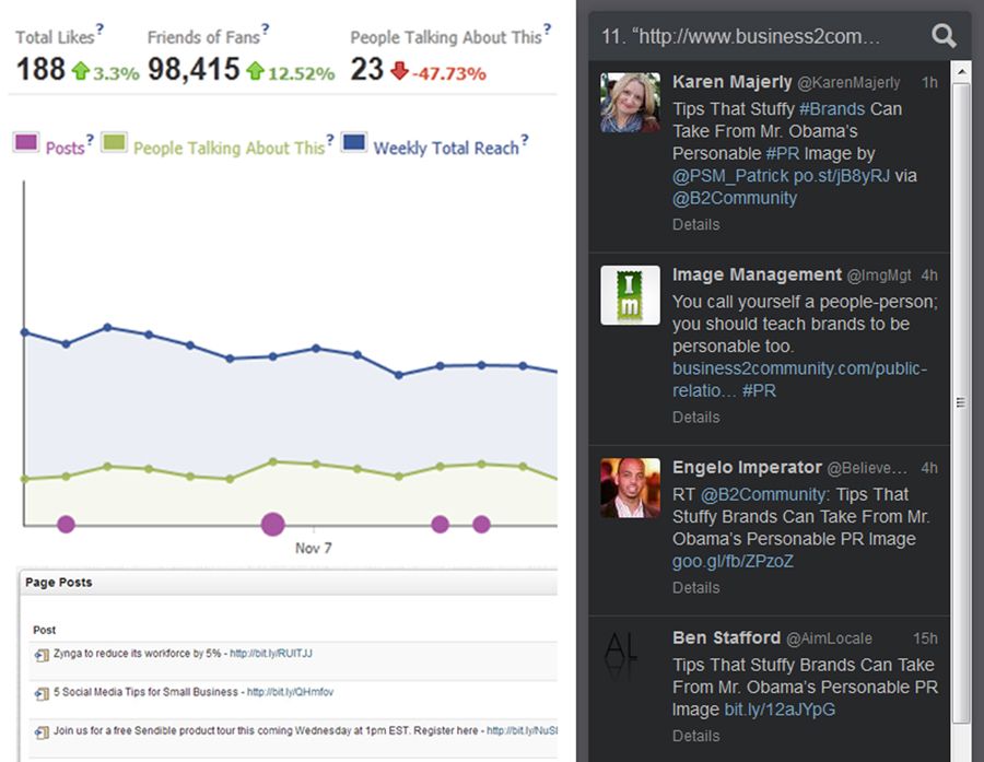 So how do we do this? Well, you should already be acquainted with some of the simpler (and free) tools for tracking content activity. The share buttons at the top of posts track the number of likes, tweets, shares, and more. This can tune you in to which social networks your content is best performing on. From there, TweetDeck allows the user to search and track particular URLs as they’re shared across Twitter. Facebook has insights for business pages (but unfortunately not for personal profiles) that can show you the reach and magnitude of your post’s virality.